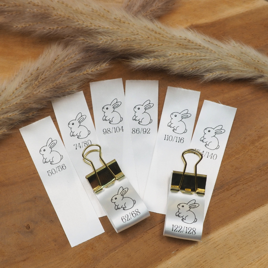 5 Stück Satin Größen Label mit dem Motiv Hase und deiner Wunschgröße als Motiv. Die Label sind weiß mit schwarzem Motiv.