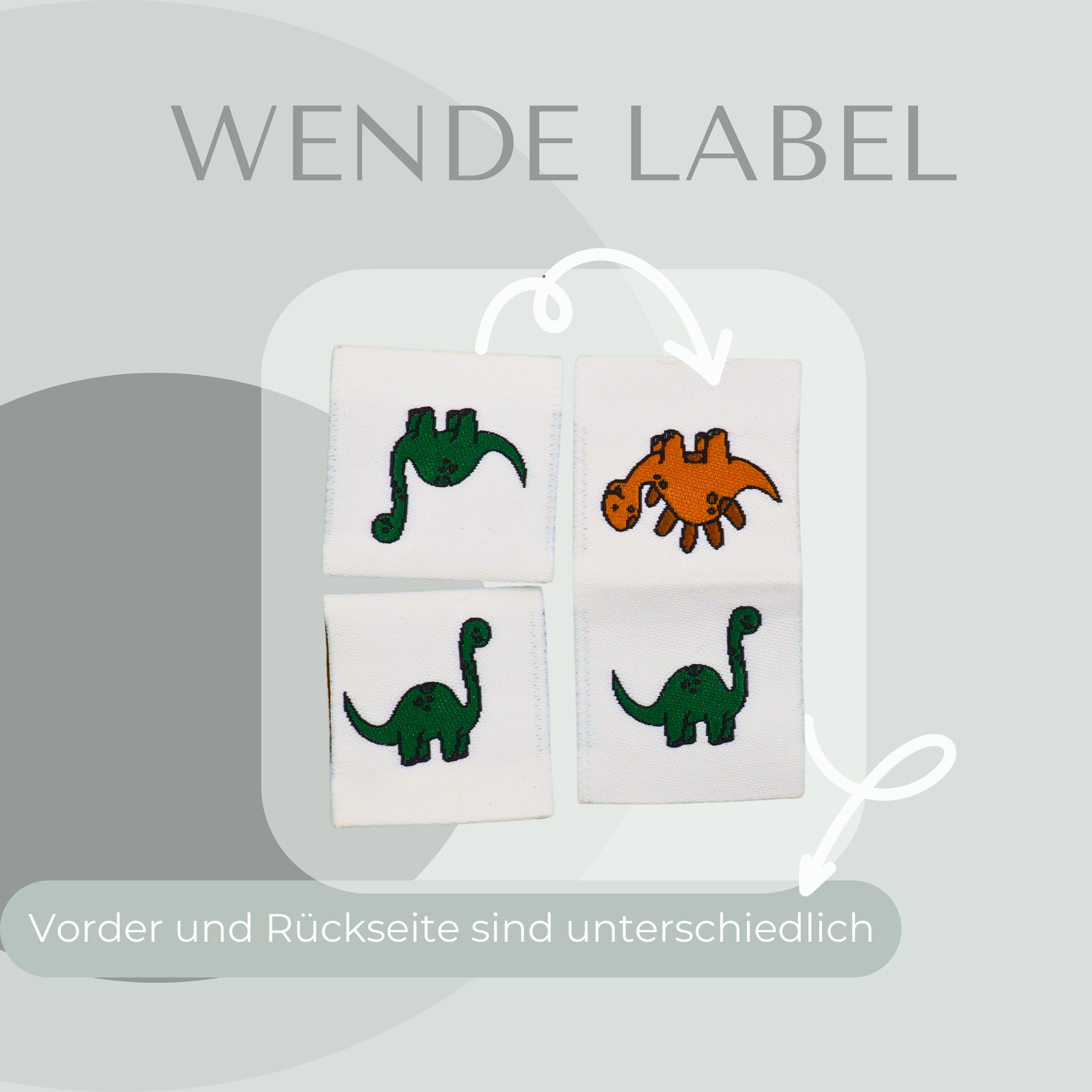 1 Stück gewebtes Label mit zwei unterschiedlich gewebten Seiten. Auf einer Seite befindet sich ein Brachiosaurus und auf der anderen Seite ein Stegosaurus.