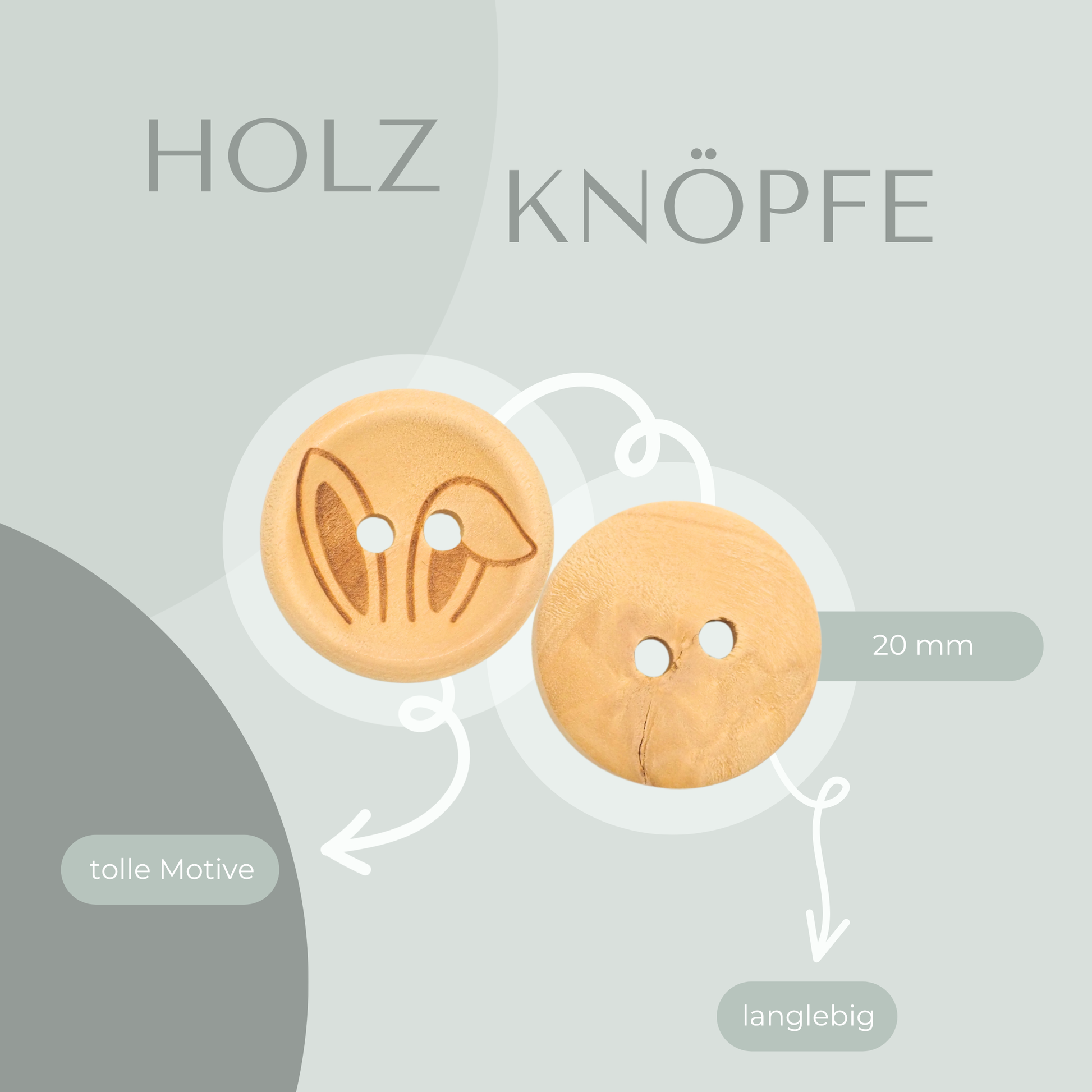 Unsere Holzknöpfe bestehen aus unbehandeltem, unlasiertem Naturholz. Sie sind ideal für Projekte mit einem natürlichen, sanften Look – etwa für Baby- und Kinderkleidung, Leinenstoffe oder nachhaltige Mode.