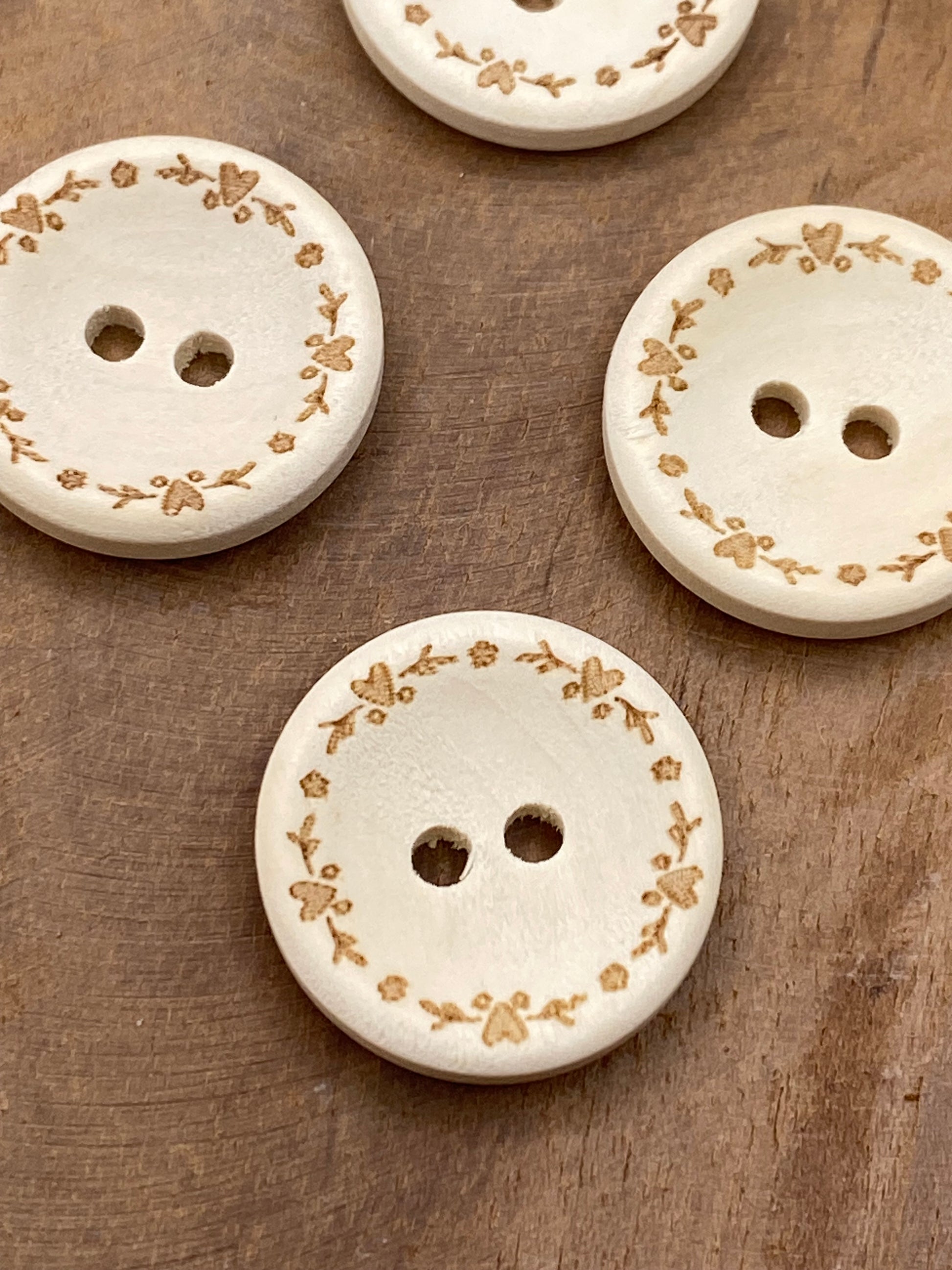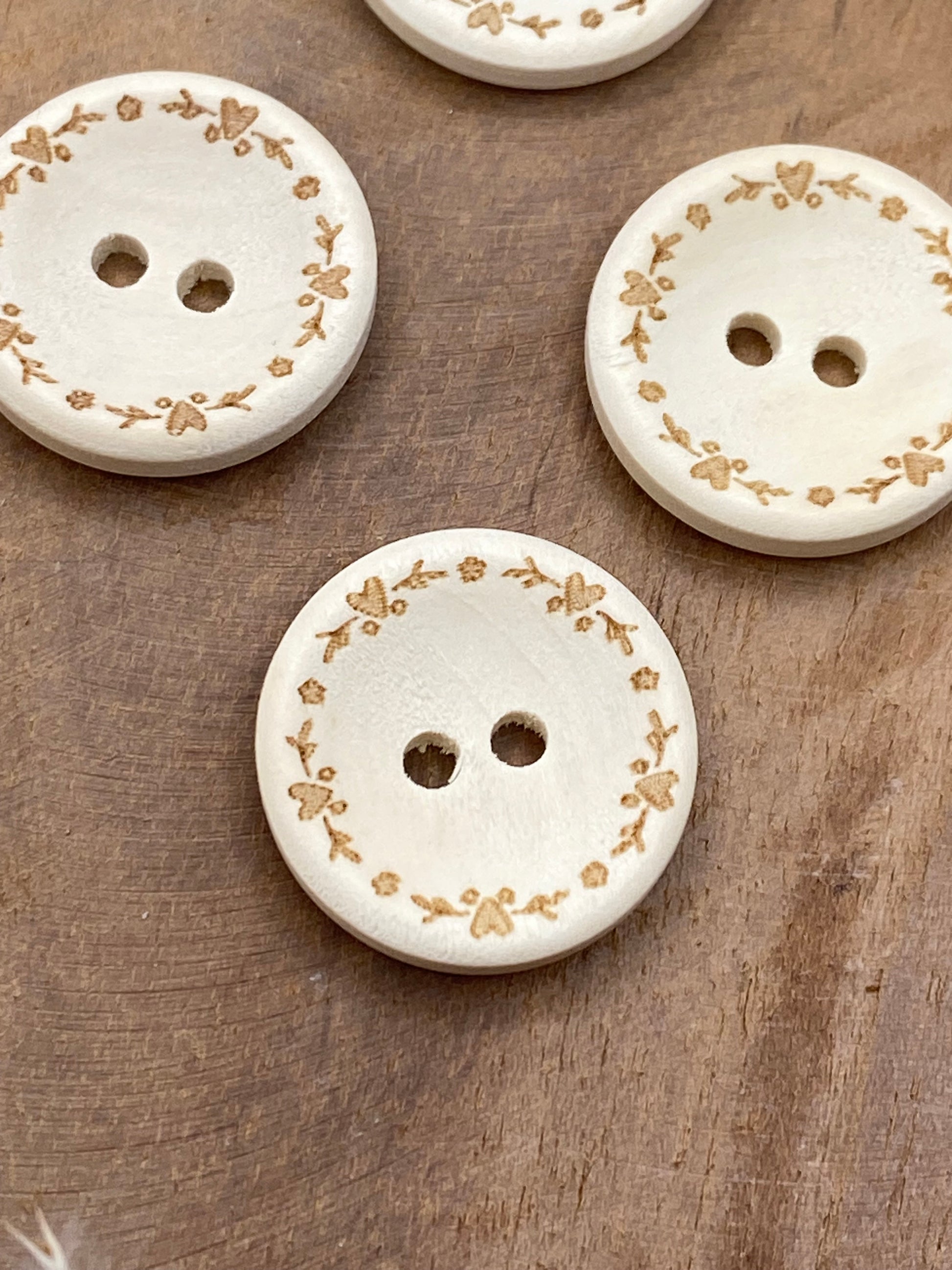 Unsere Holzknöpfe bestehen aus unbehandeltem, unlasiertem Naturholz. Sie sind ideal für Projekte mit einem natürlichen, sanften Look – etwa für Baby- und Kinderkleidung, Leinenstoffe oder nachhaltige Mode.