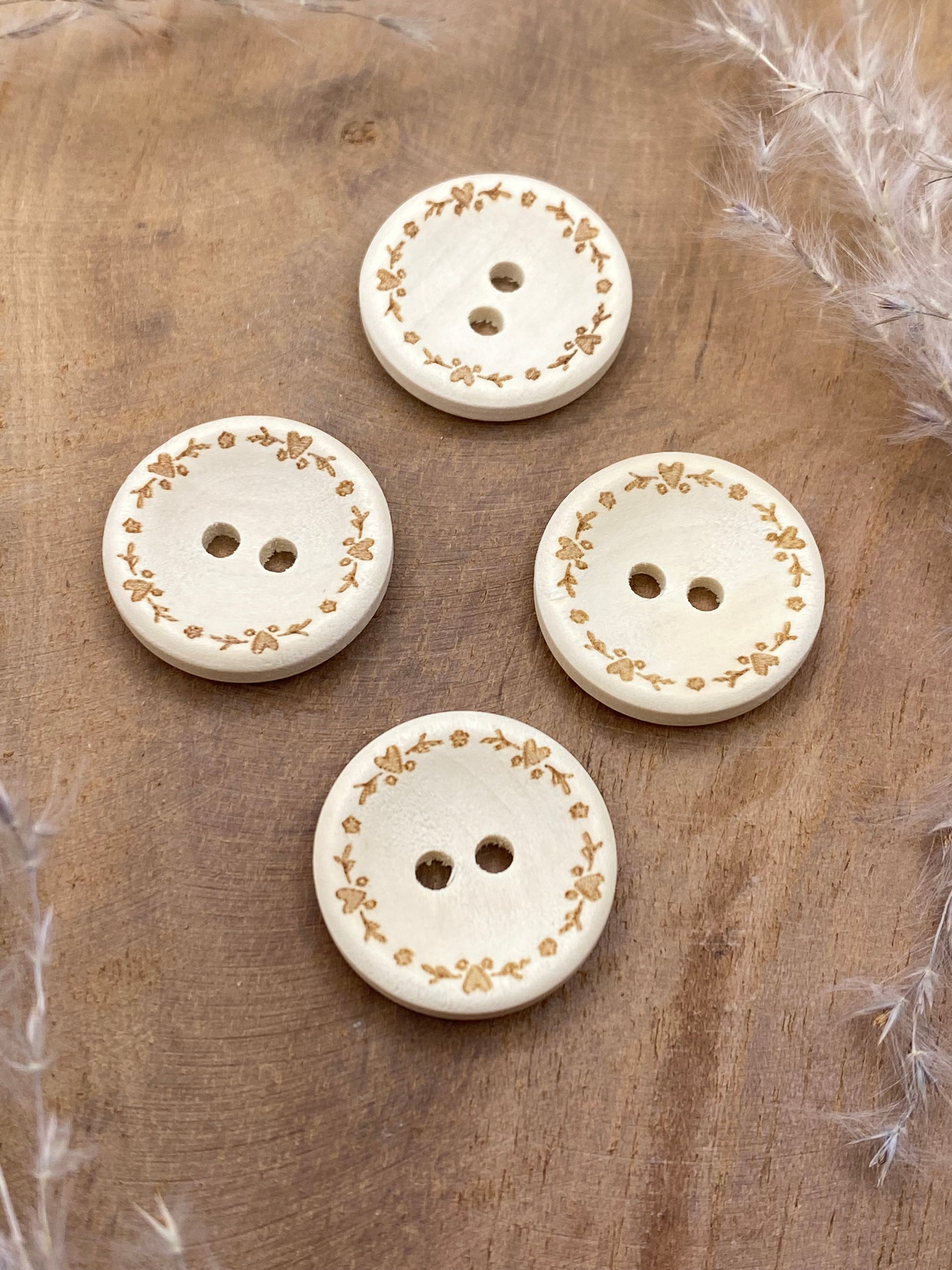 1 Stück Holzknopf Rund mit Herz-Kranz.
