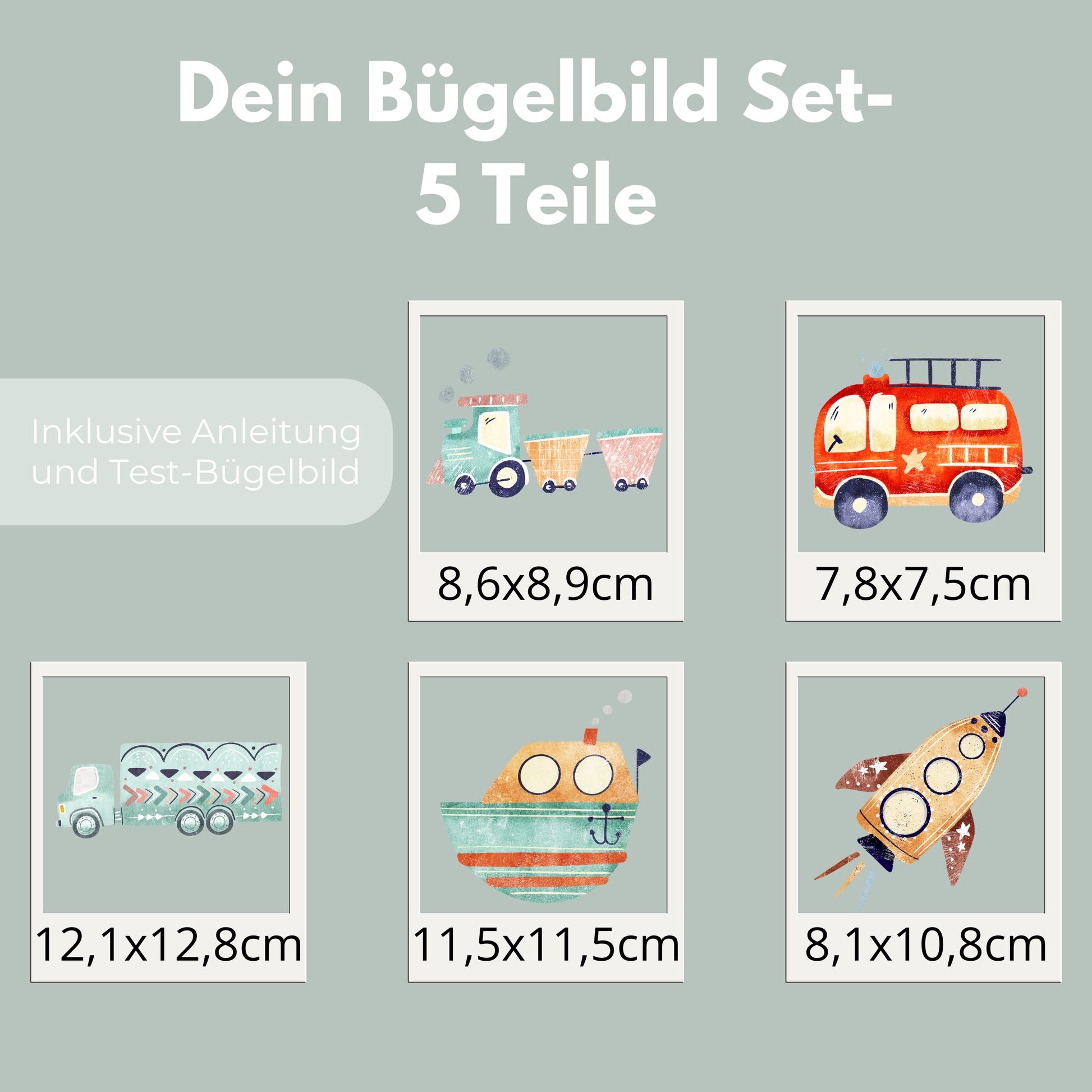 1 Stück Bügelbild-Set mit 5 verschiedenen Motiven in der Größe Din A4 mit dem Thema Fahrzeuge.