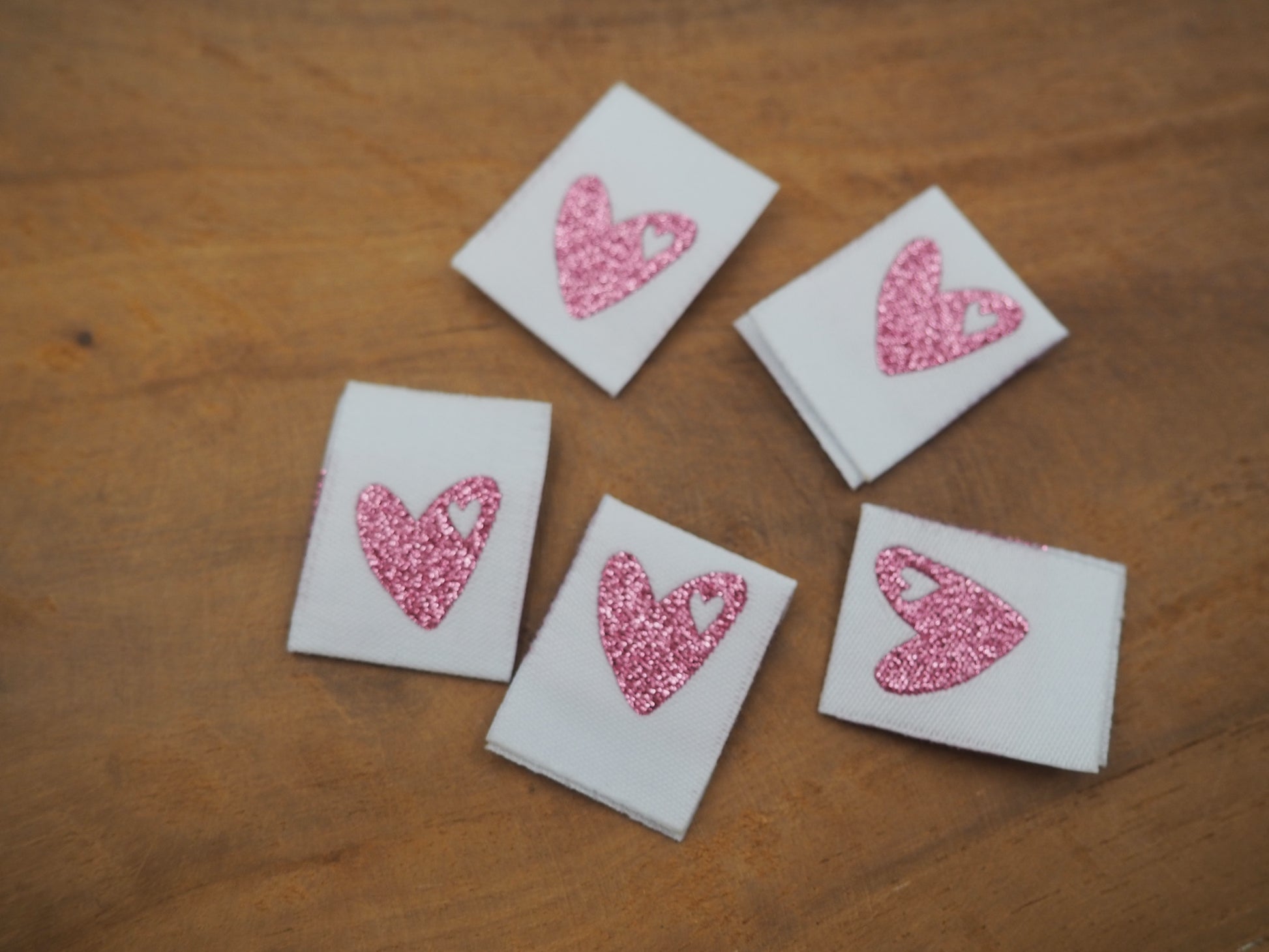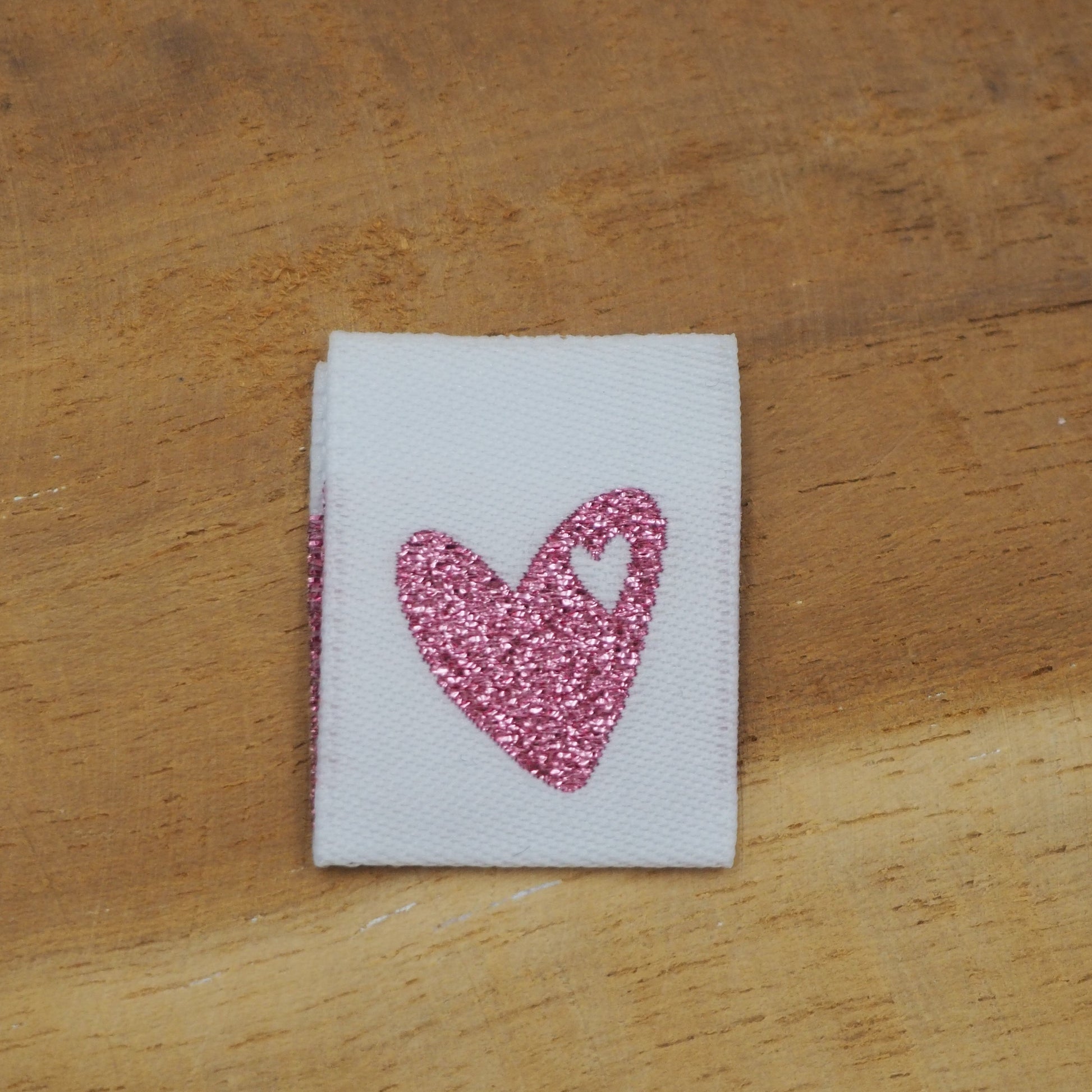 1 Stück gewebtes Label mit einem Rosa Herz auf einem Weißen Label.