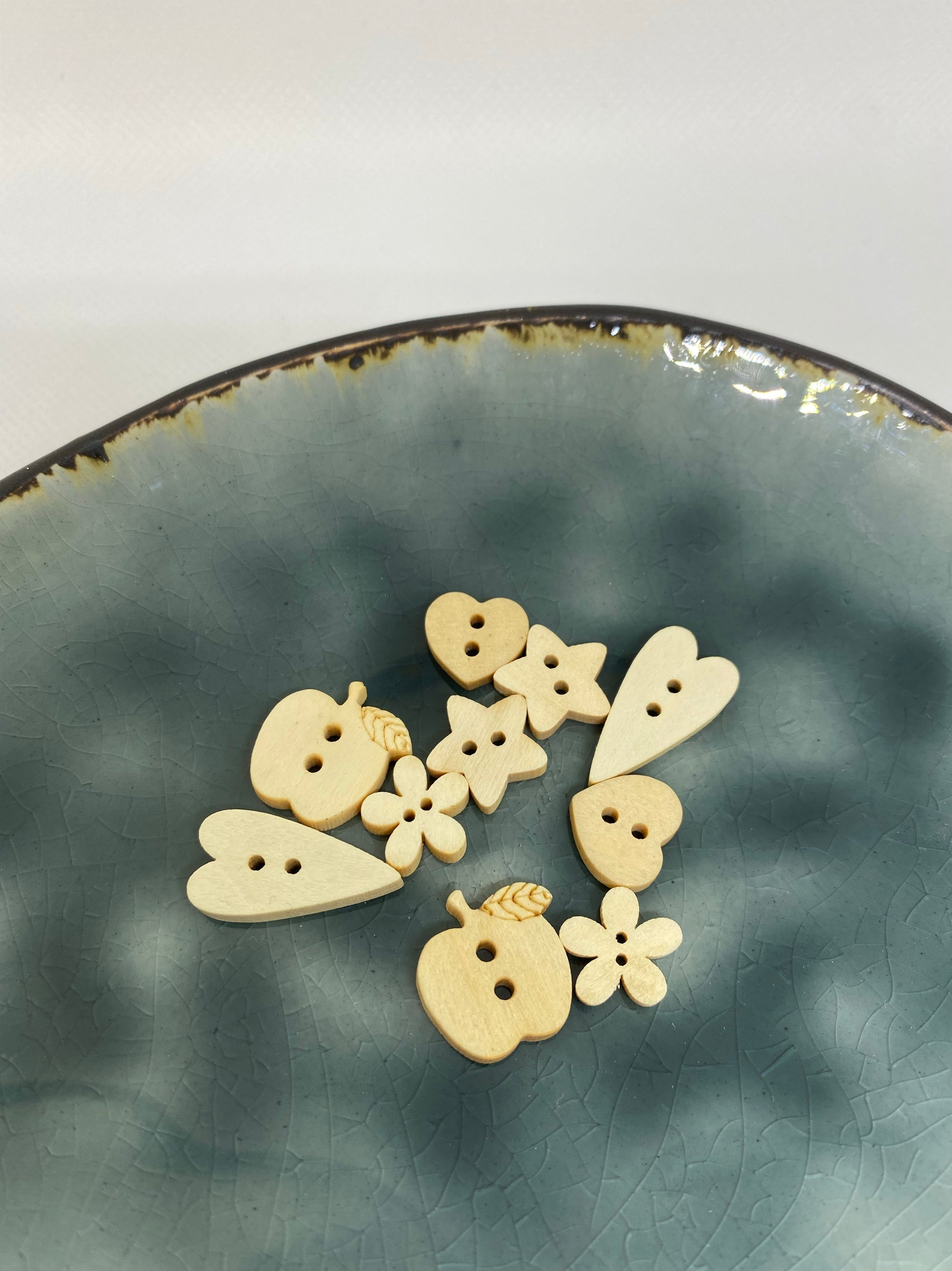 Unsere Holzknöpfe bestehen aus unbehandeltem, unlasiertem Naturholz. Sie sind ideal für Projekte mit einem natürlichen, sanften Look – etwa für Baby- und Kinderkleidung, Leinenstoffe oder nachhaltige Mode.