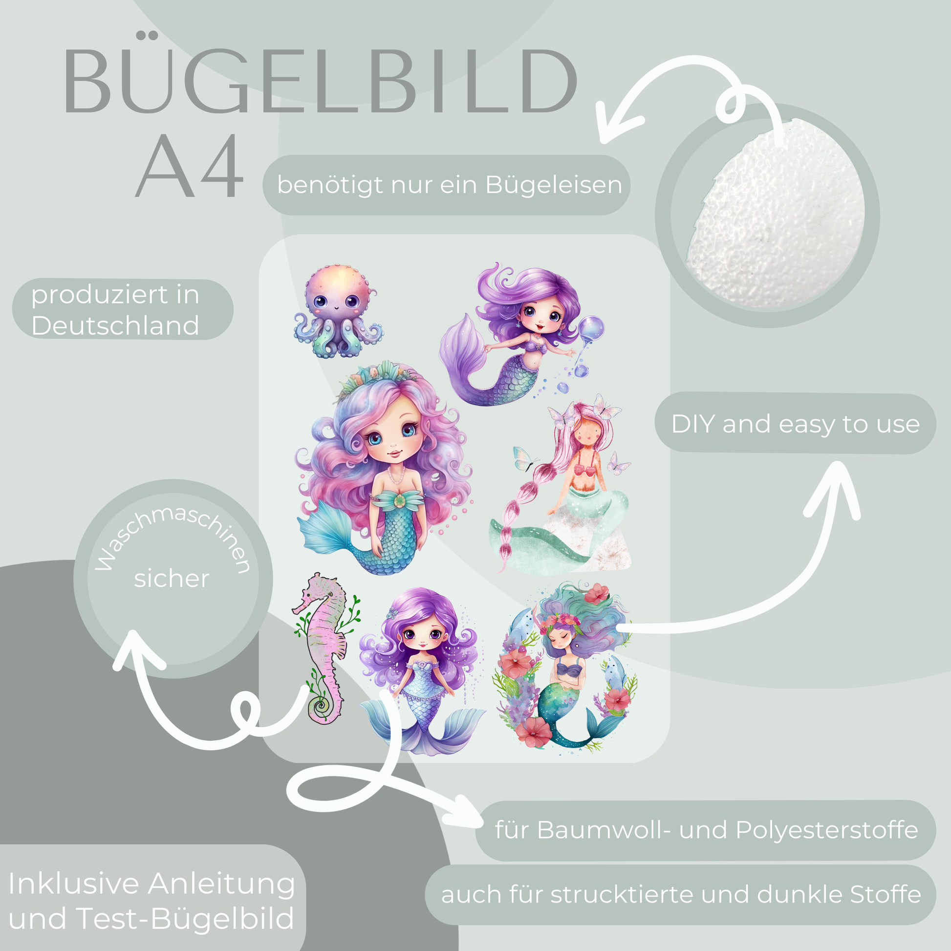 Das Bügelbild-Set hat die Größe Din A4 und beinhaltet 7 Bügelbilder.