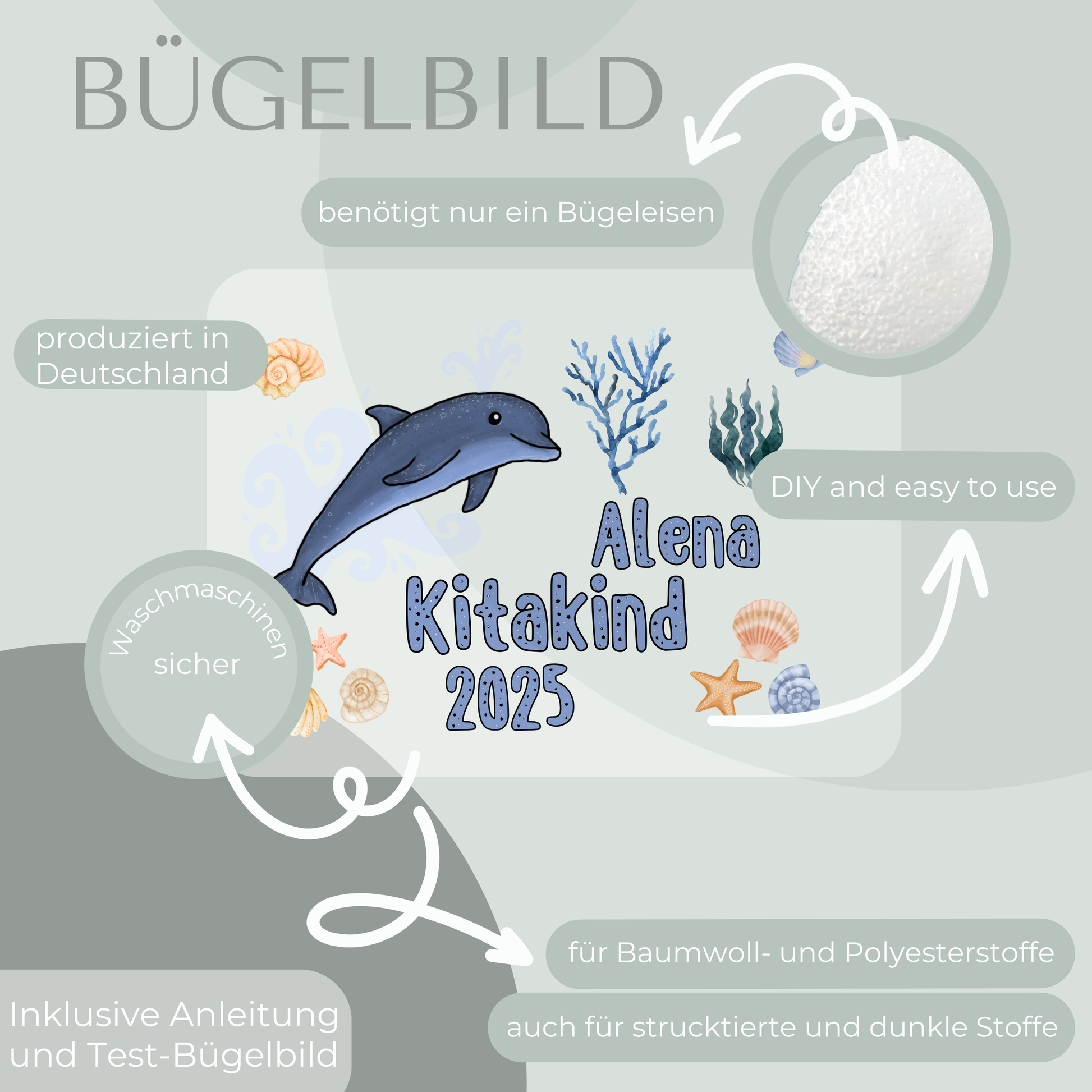 1 personalisierteres Bügelbild Set mit dem Motiv "Kitakind 2025 Delfin".