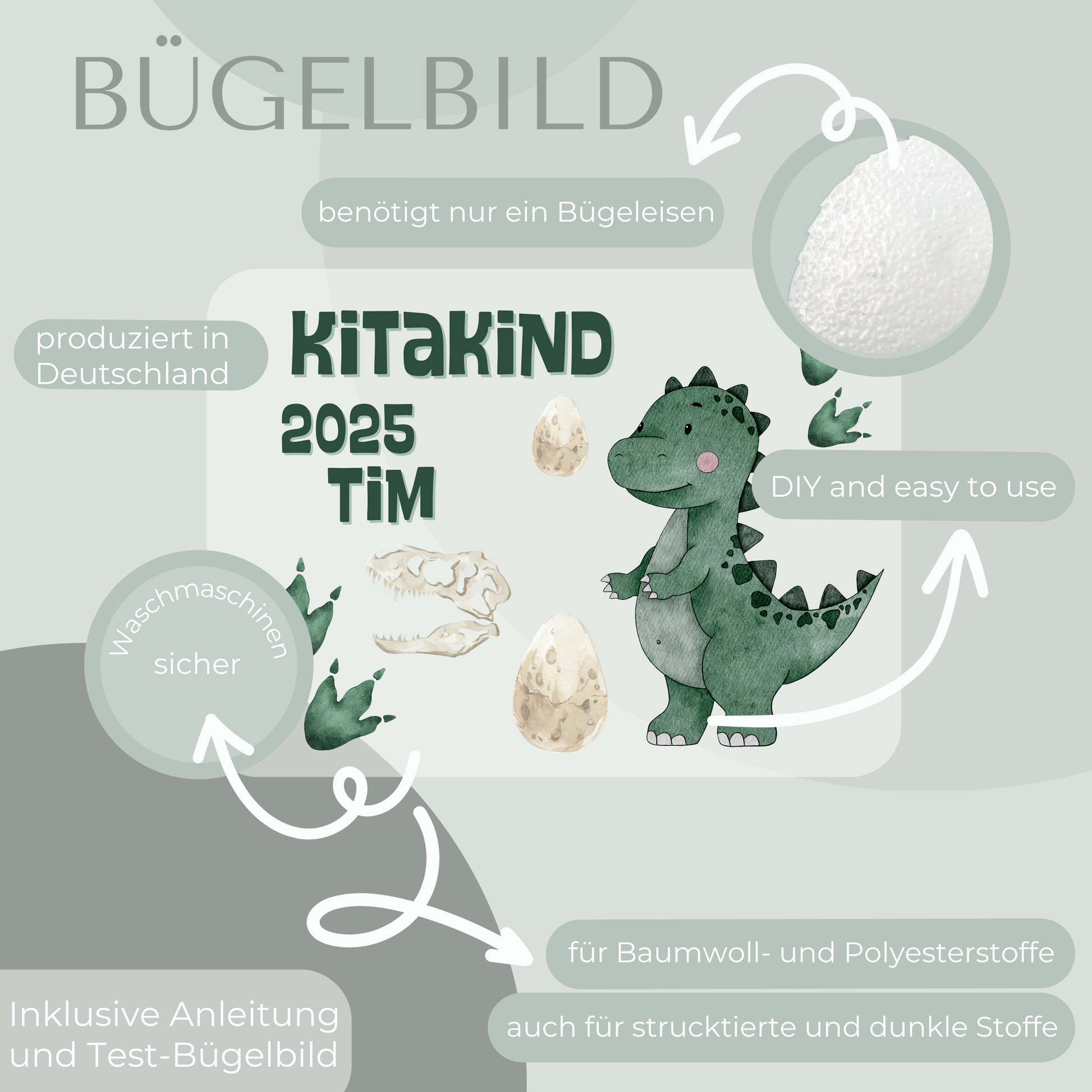 1 personalisierteres Bügelbild Set mit dem Motiv "Kitakind 2025 Dinosaurier".