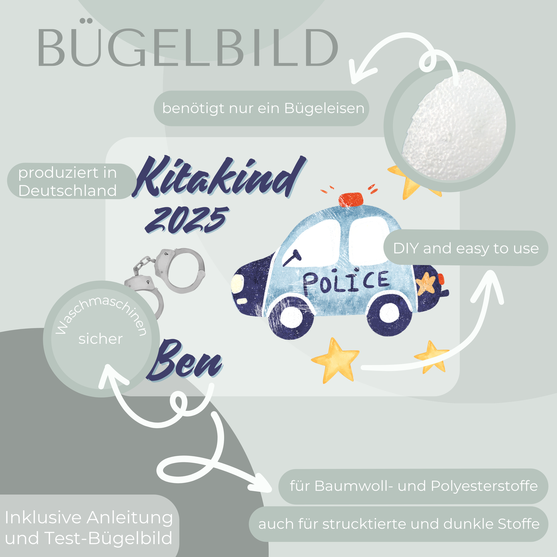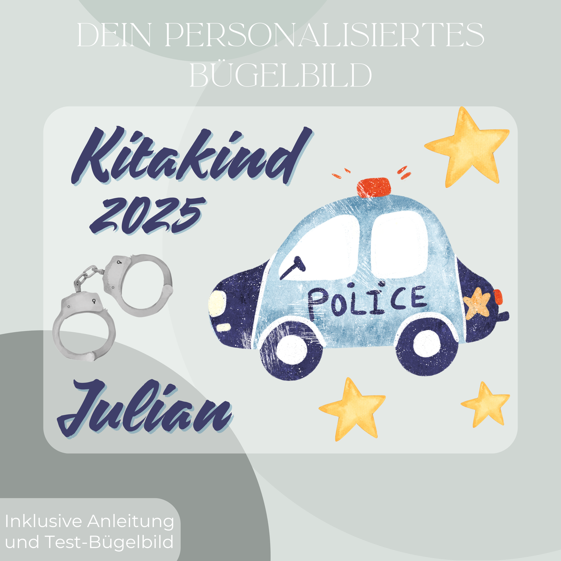 1 personalisierteres Bügelbild Set mit dem Motiv "Kitakind 2025 Polizei".
