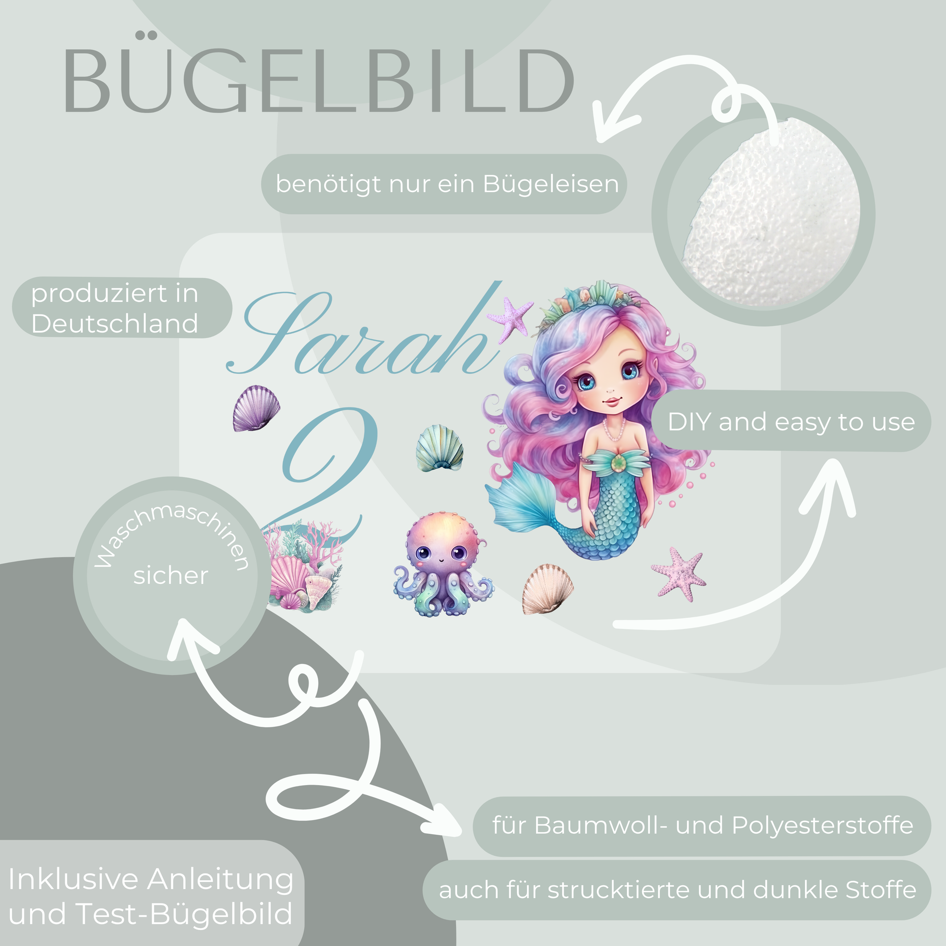 1 personalisierteres Bügelbild Set mit dem Motiv "Meerjungfrau".