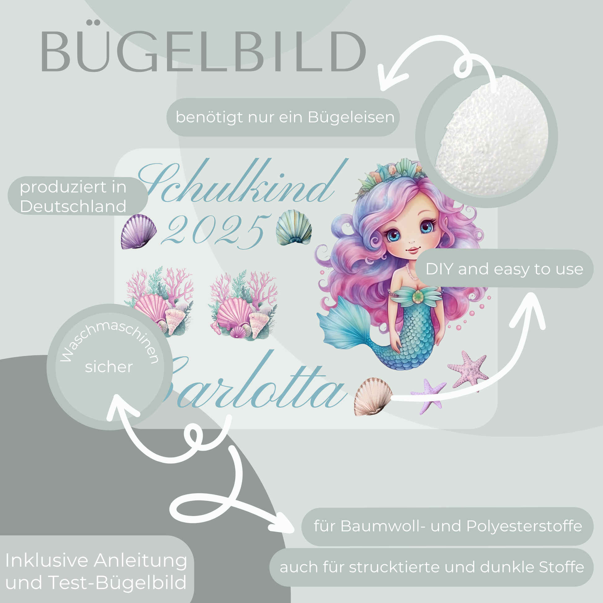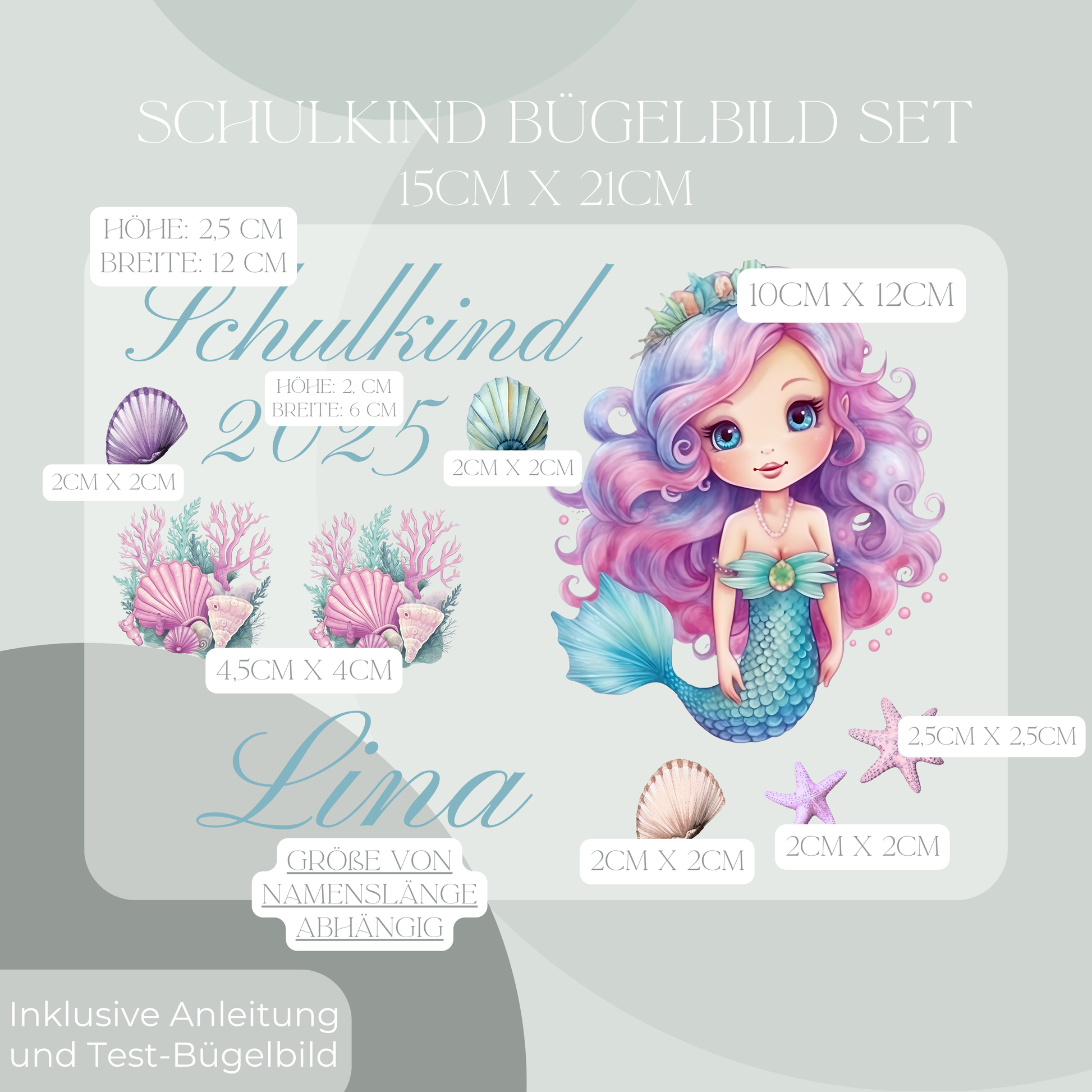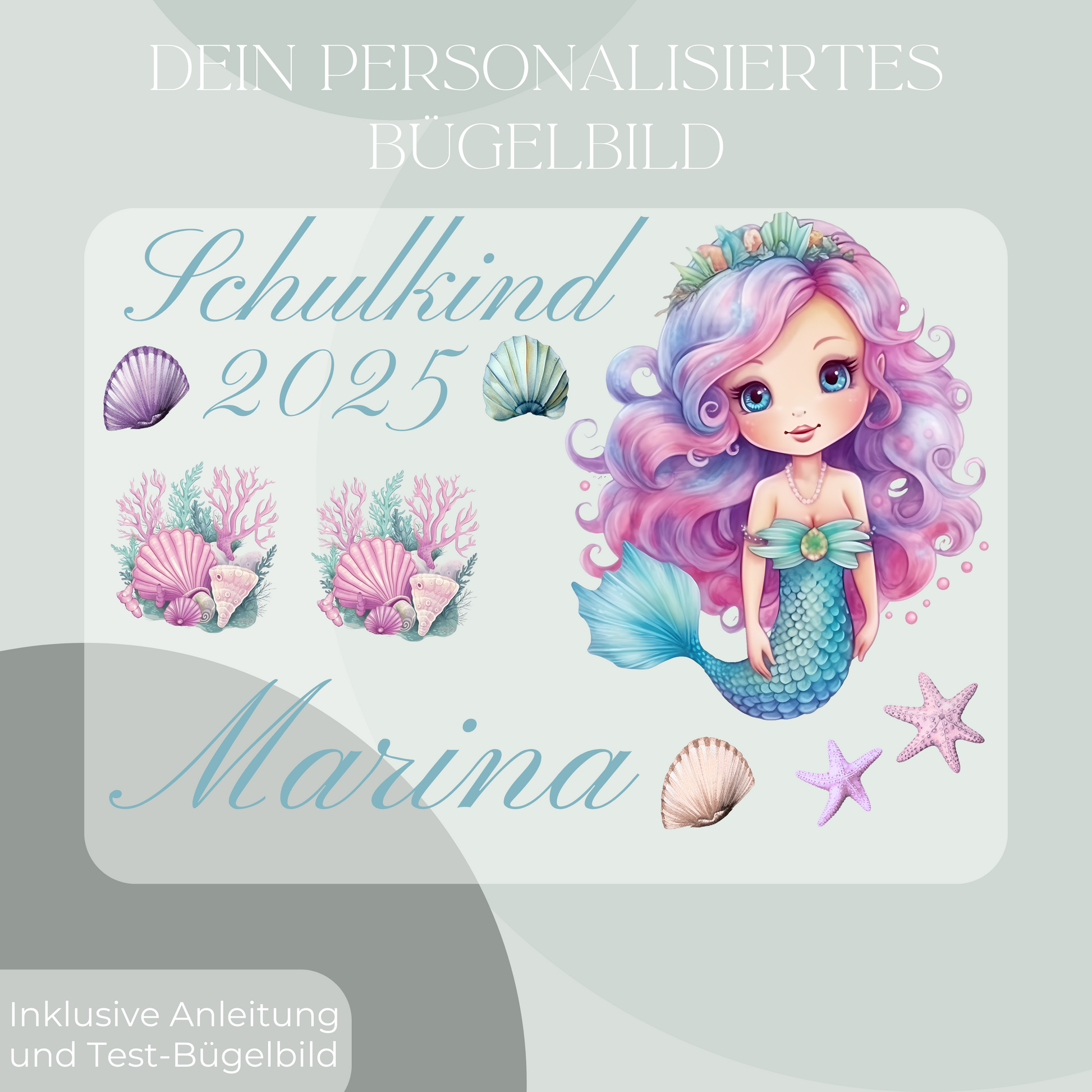 1 personalisierteres Bügelbild Set mit dem Motiv "Schulkind 2025 Meerjungfrau".