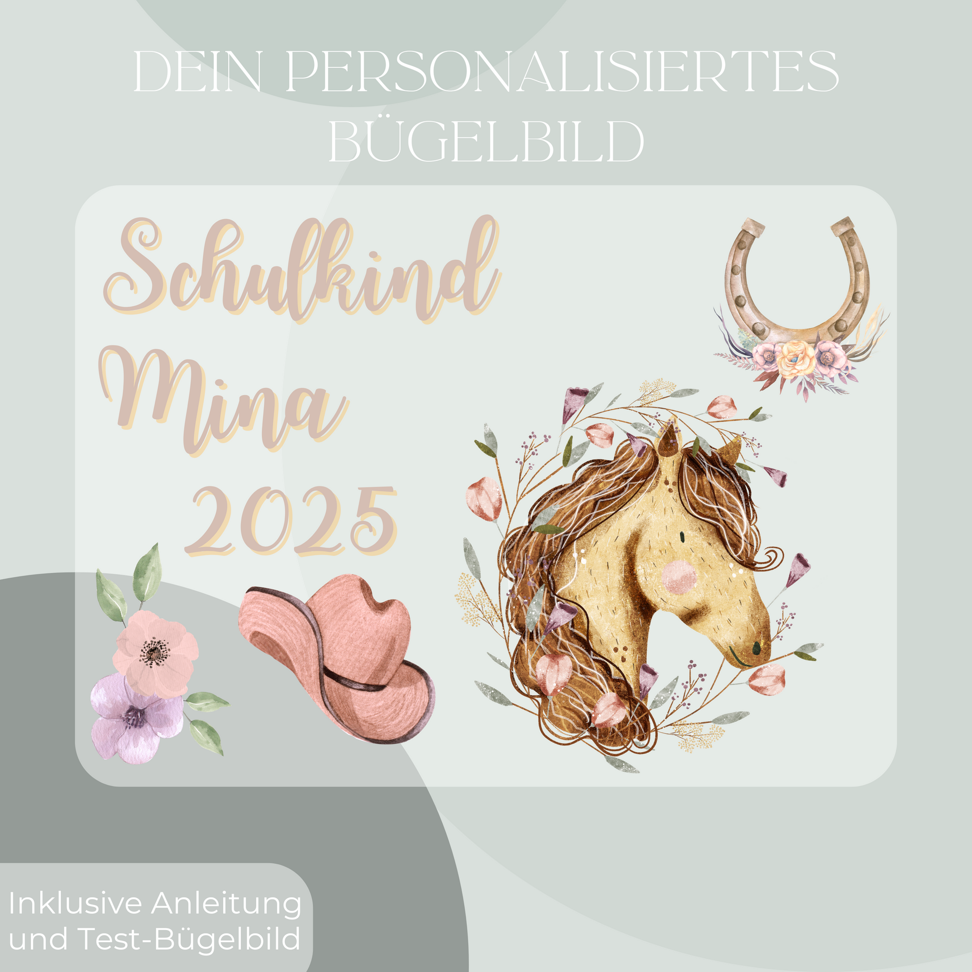 1 personalisierteres Bügelbild Set mit dem Motiv "Schulkind 2025 Pferd".