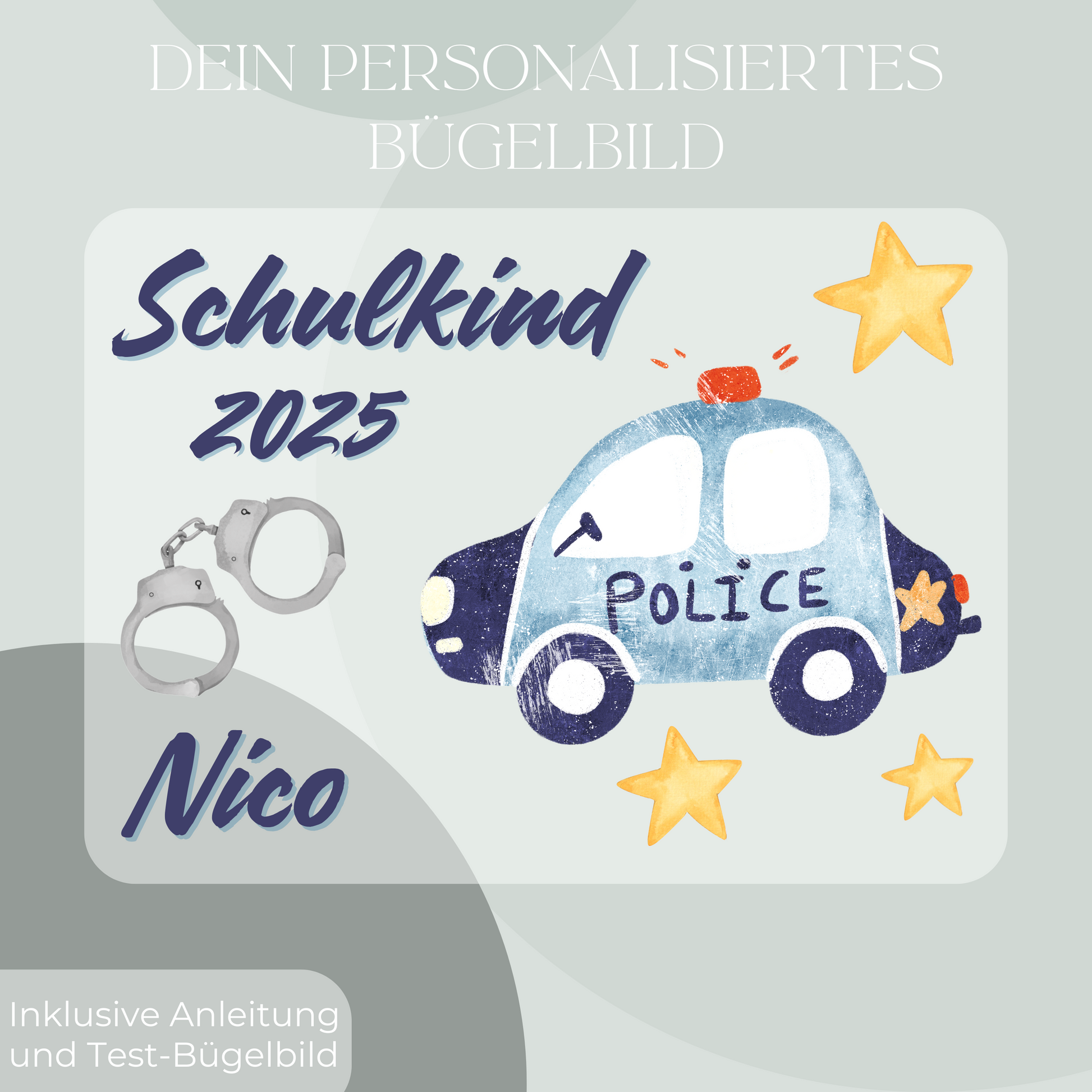 1 personalisierteres Bügelbild Set mit dem Motiv "Schulkind 2025 Polizei".