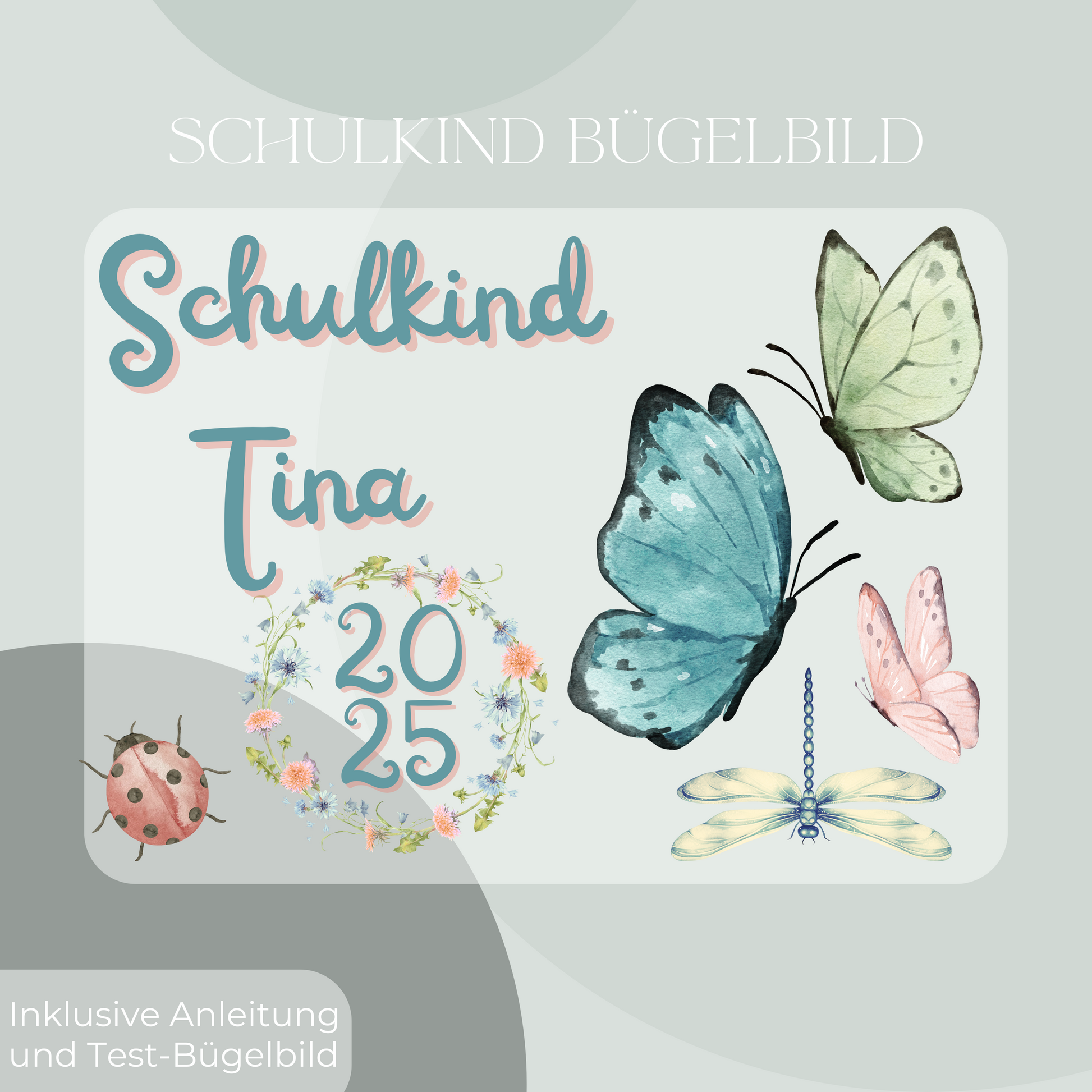 1 personalisierteres Bügelbild Set mit dem Motiv "Schulkind 2025 Schmetterling".