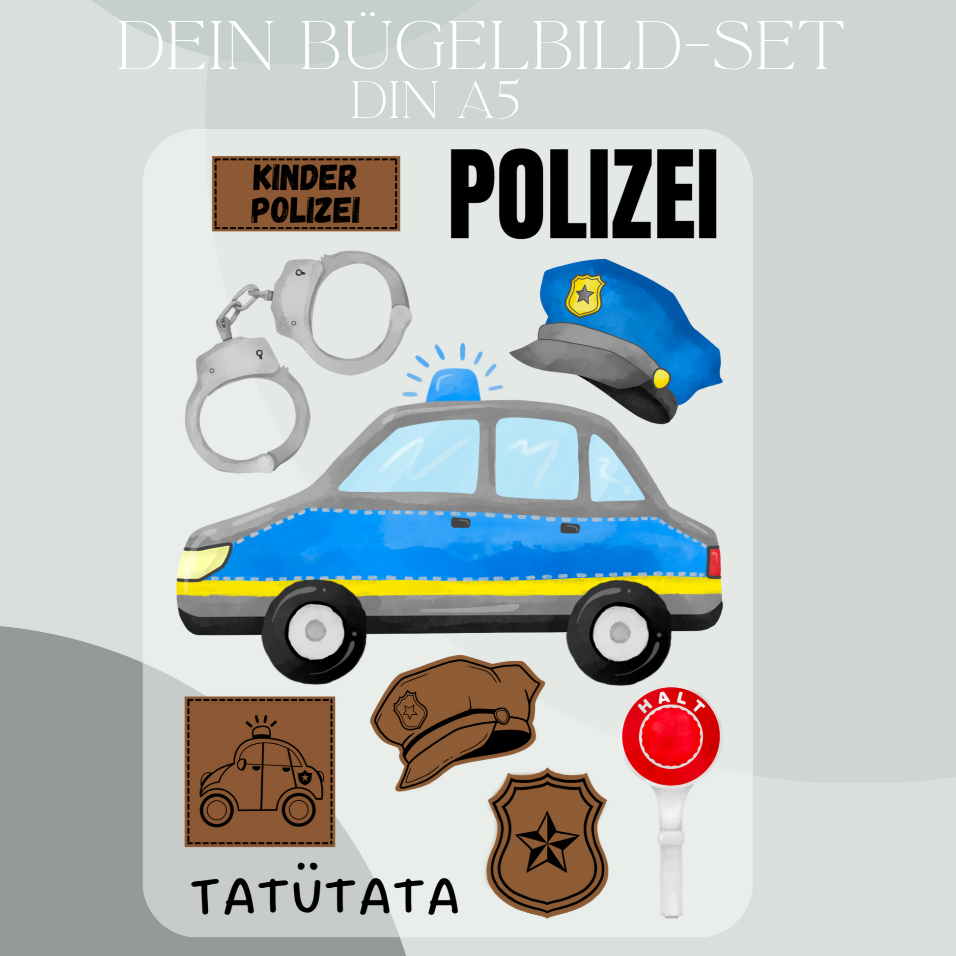 1 Stück Bügelbild-Set mit 10 verschiedenen Motiven in der Größe Din A5 mit dem Thema Polizei.