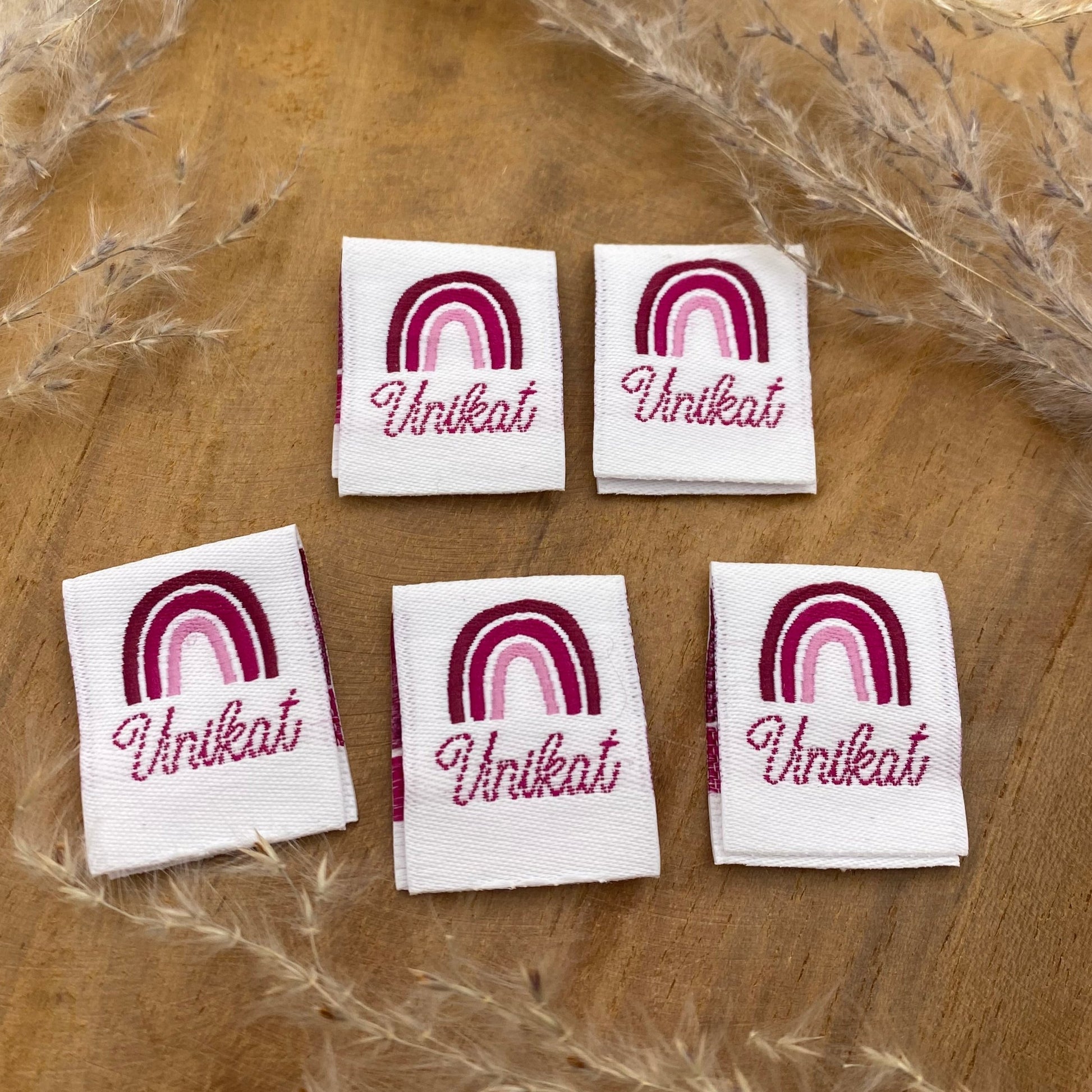 1 Stück gewebtes Label mit "Unikat" Aufschrift und einen Regenbogen in Rosa Tönen.
